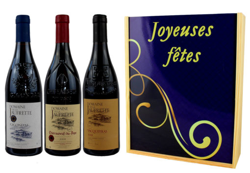 Coffret cadeau bois, votre plexi imprimée comprenant trois bouteilles du Domaine de la Jaufrette, une bouteille Château Neuf du Pape 2008, une bouteille de Gigondas 2007.